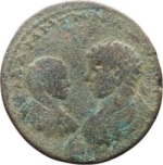 facing busts of Elagabalus, laureate, draped and cuirassed, left, and Severus Alexander, bare-headed, draped and cuirassed, right.; below, small temple with pediment