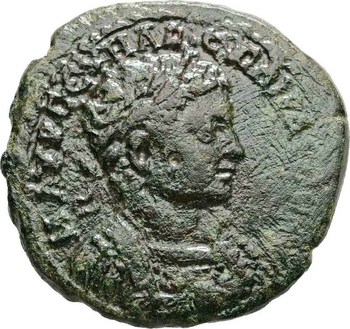 laureate and cuirassed bust of Severus Alexander, right, seen from front