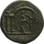 front view of temple with four columns with arcuated lintel in the middle, within which Tyche standing facing, head left, wearing kalathos, holding rudder and cornucopia, crowned by Nike standing, left, on small column behind her; two small figures between the outer two columns on each side |