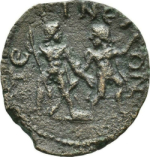 two bearded male figures standing facing, looking at each other, each wearing a chlamys and holding a spear