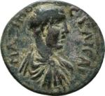 bare-headed, draped and cuirassed bust of Maximus, right, seen from rear