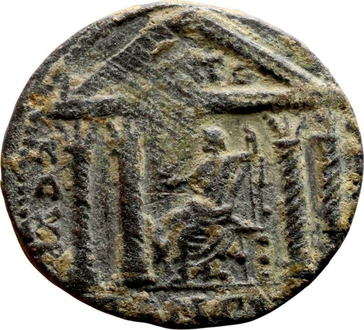 Reverse design front view of temple with four columns with tortile columns, within which Zeus seated, left, holding long sceptre and thunderbolt; at his feet, eagle, right; date in pediment