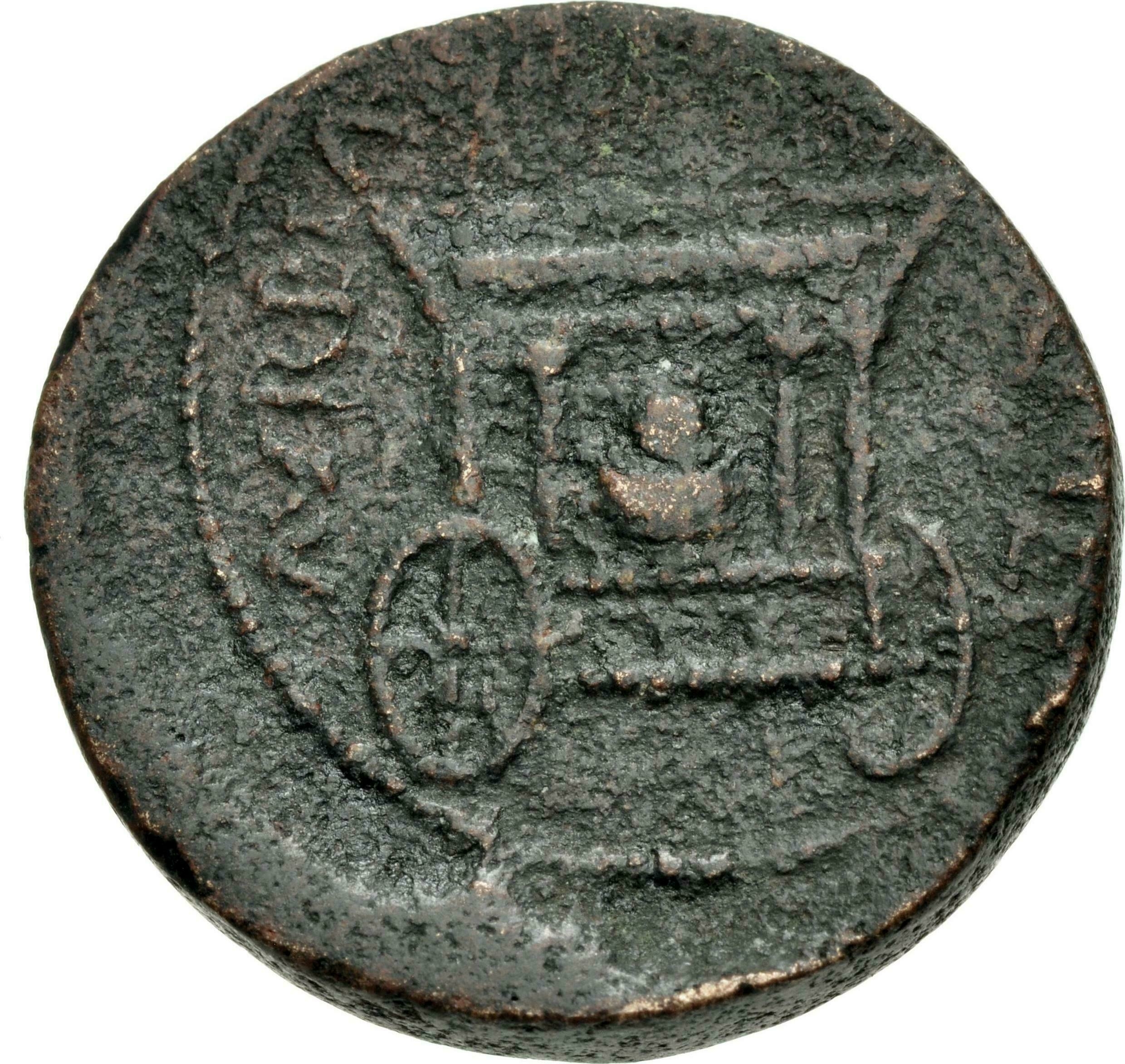three-quarter view of two-wheel car of Astarte, right, with shrine with four columns within which baetyl; on the roof, two palm branches