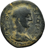 bare-headed, draped and cuirassed bust of Maximus, right, seen from rear