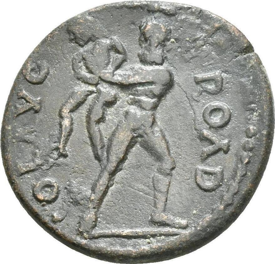 Heracles nude standing, right, head left, wrestling against the giant Antaeus and lifting him off the ground