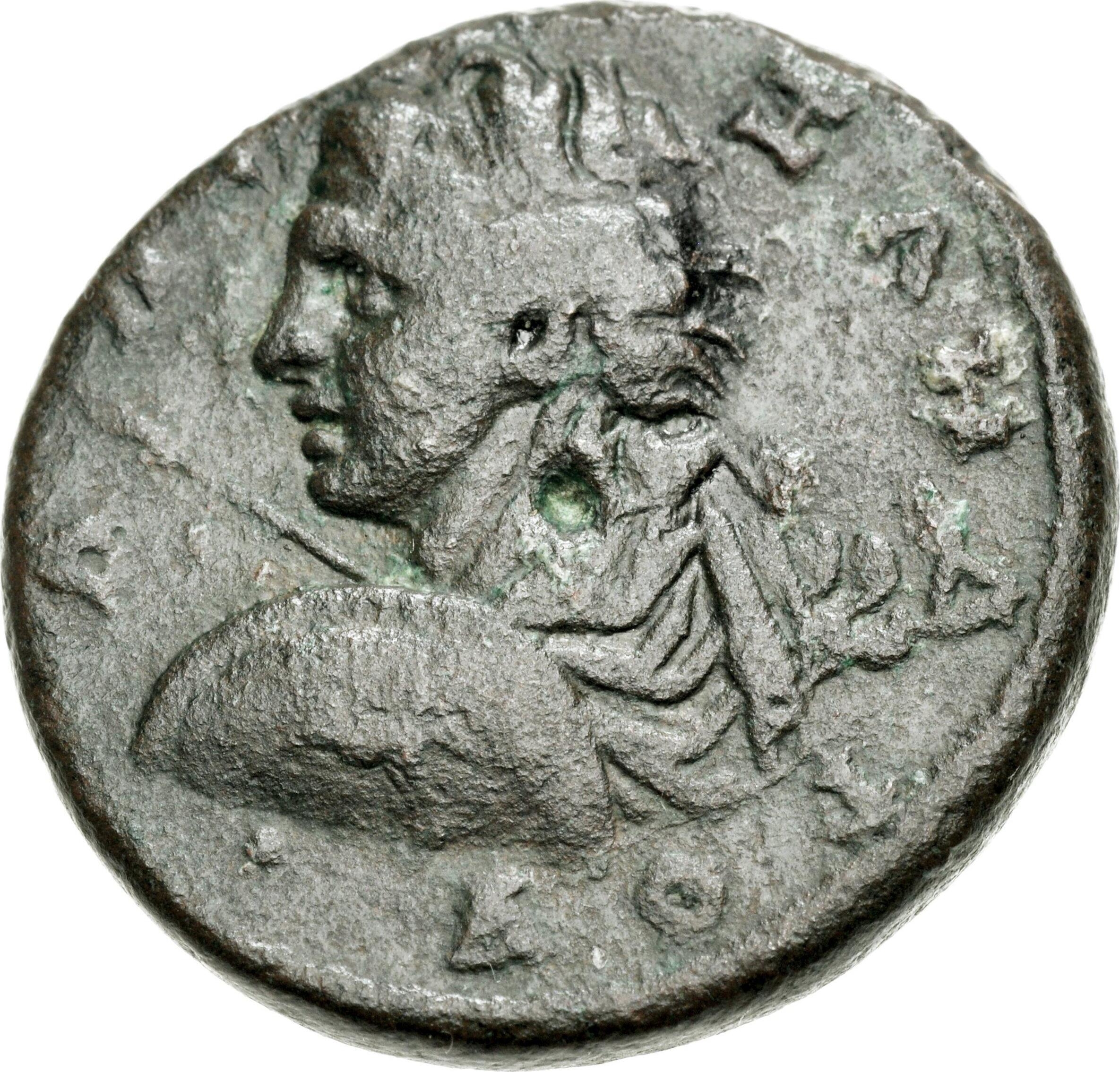 diademed and draped bust of Alexander the Great, left, with flowing hair, holding shield and spear