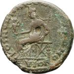 Macedonia seated, left, wearing kalathos, holding Kabeiros and sceptre