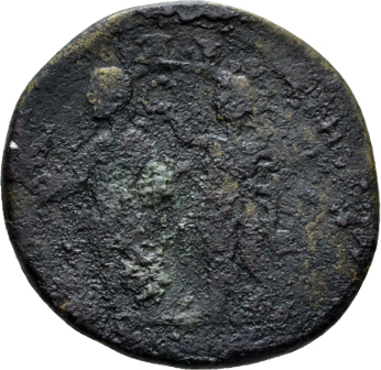the Emperor standing in military dress, left, holding patera, being crowned by Nike standing behind him, left, holding palm branch and wreath