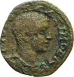 bare-headed, draped and cuirassed bust of Maximus, right, seen from front