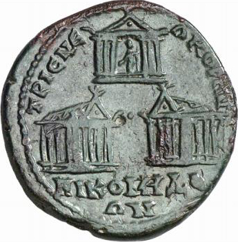 three temples with six columns, the one above seen from the front, whithin which a statue of Demeter(?) stands, left, the others below seen from a three-quarter view