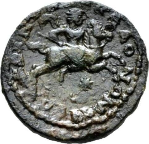 Alexander the Great riding Bucephalus galloping right, his mantle floating behind him, holding couched spear; below, star