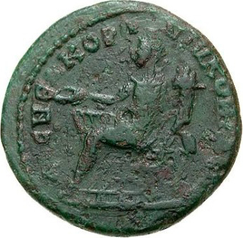 Homonoia seated, left, wearing kalathos, holding patera and cornucopia