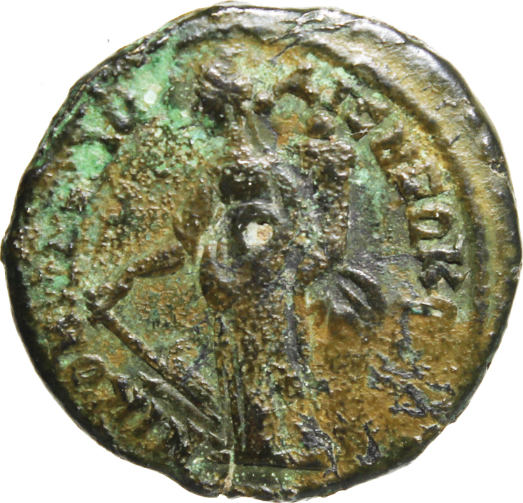 Tyche standing facing, head left, wearing kalathos, holding rudder and cornucopia