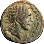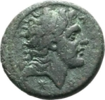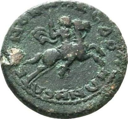 Alexander the Great riding Bucephalus galloping, right, his mantle floating behind him, hurling spear; below, star