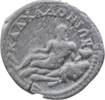 Heracles reclining on lion skin, surmounted by drinking bowl left, looking back; club on ground