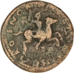 Alexander the Great riding Bucephalus galloping, right, his mantle floating behind him, hurling spear; below, star