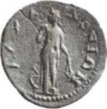 Nemesis standing facing, head left, holding cubit rule and raising hand to pluck chiton; at her feet, wheel