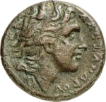 diademed head of Alexander the Great, right, with flowing hair; below, wreath
