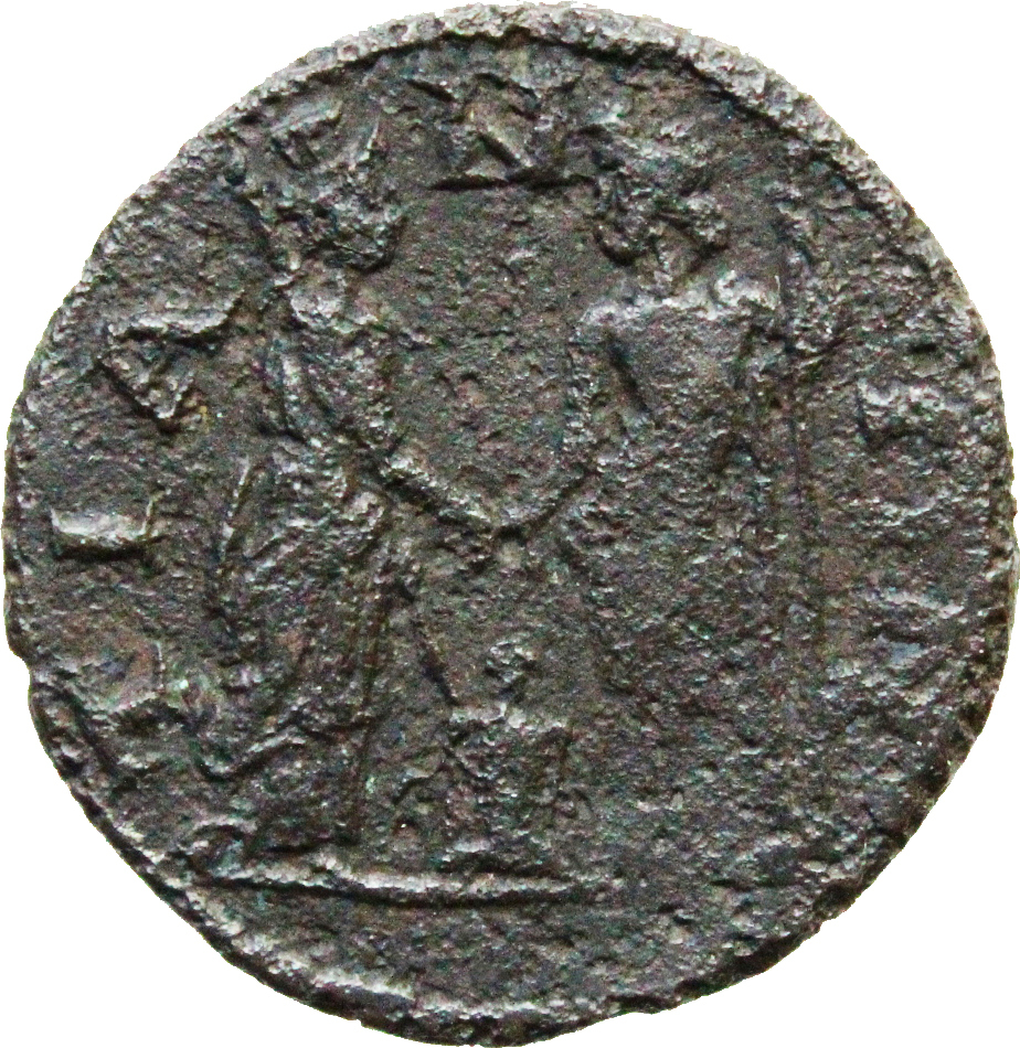 turreted Tyche standing, right, holding long sceptre and grasping hand of a male figure standing, left, wearing himation and holding long sceptre; between them, lighted altar