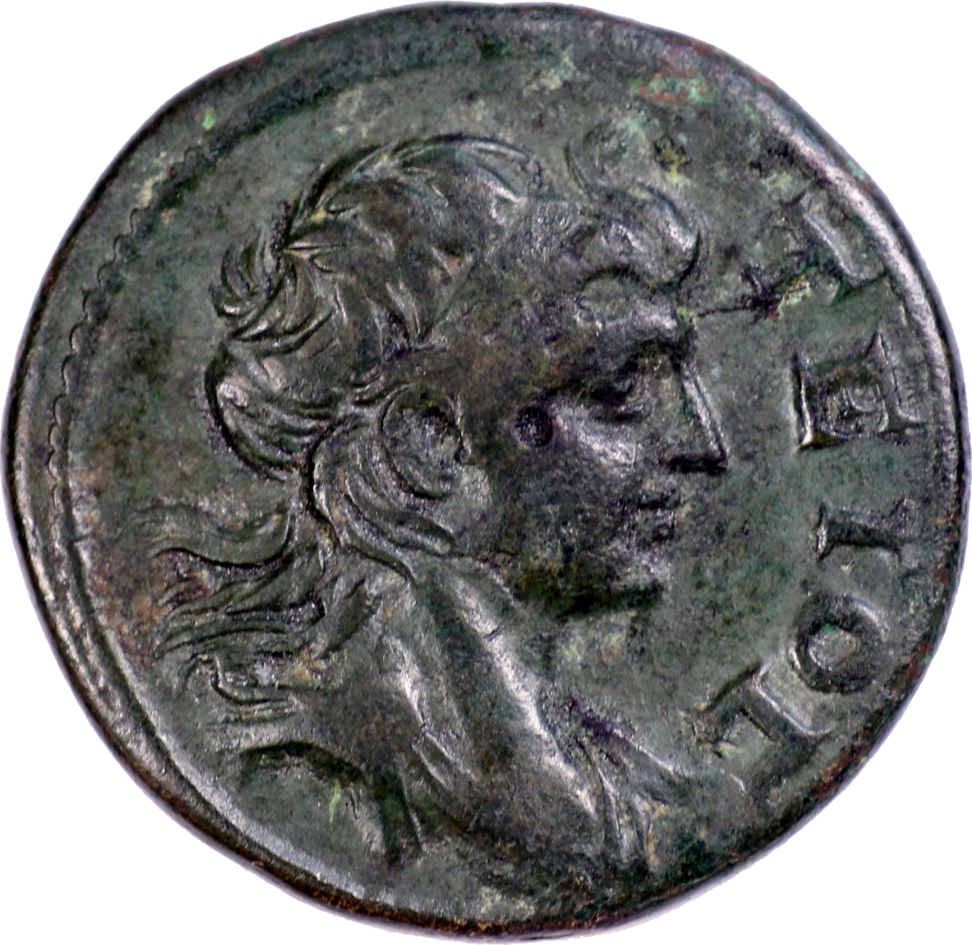the Tyche of the City seated on throne, left, wearing turreted crown(?),holding ears of corn and cornucopia