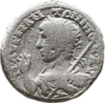 laureate and draped bust of Elagabalus, left, holding spear on his shoulder and raising hand, seen from front
