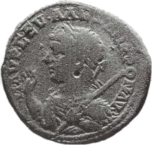 laureate, draped and cuirassed bust of Severus Alexander, left, holding sceptre and raising hand, seen from front