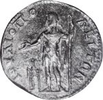 the Emperor standing facing in military dress, head left, holding spear and patera over lighted altar; (forepart of bull to left)