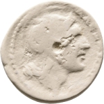 Alexander the Great riding Bucephalus galloping right, his mantle floating behind him, hurling spear at lion