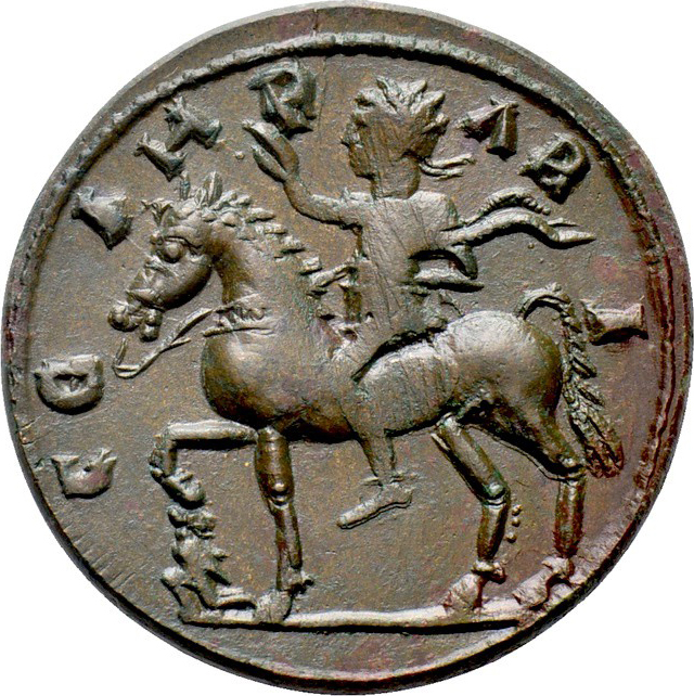 the Emperor on horseback advancing, left, wearing chlamys and saluting; at the horse's feet, captive kneeling, left, looking back, with hands tied behind his back