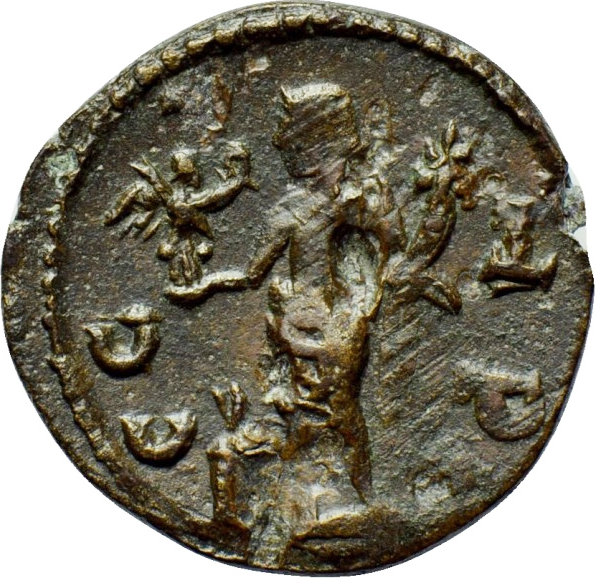 Genius Coloniae standing facing, head left, holding cornucopia and Nike over lighted altar