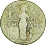 Athena standing facing, head left, holding spear and Nike; at her feet, behind, shield |