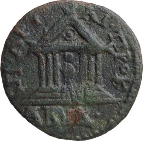 front view of temple with six columns with globe in pediment, within which statue of Artemis Ephesia standing facing, having supports