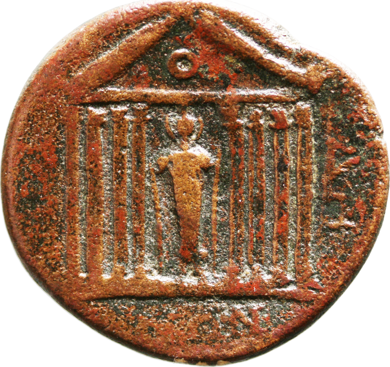 front view of temple with eight columns with globe in pediment, within which statue of Artemis Ephesia standing facing, having supports