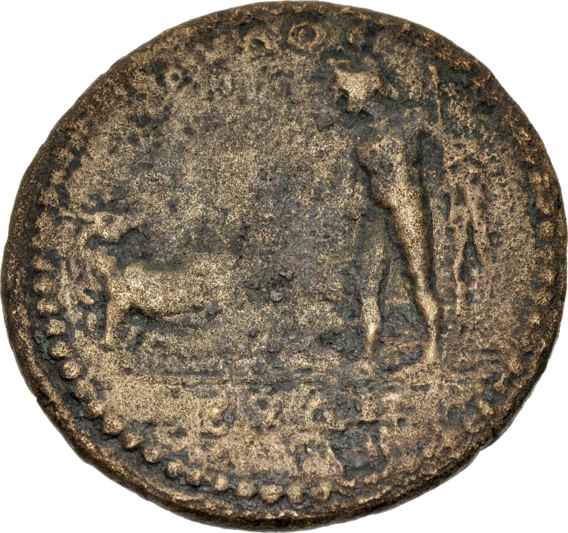 hero Abydos standing nude, left, holding chlamys and placing hand on prow at his feet; before him, cow(?), left, looking back, suckling calf; in the background, tree