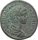 Tyche of the City(?) standing, right, holding small sceptre, behind Aeneas standing, right, wearing Corinthian helmet and presenting small Palladium to Rome standing, left, wearing Attic helmet and holding parazonium; between them, lighted altar |