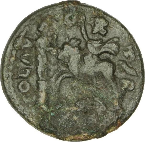 Alexander the Great(?) on horseback advancing, left, wearing chlamys and saluting, in front of cult statue of Apollo Smintheus standing, right