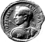 laureate, cuirassed bust of Severus Alexander, left, holding spear and decorated shield, seen from front