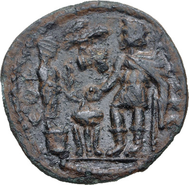 Alexander the Great(?) standing, left, wearing chlamys, holding sceptre and patera(?) over tripod, in front of cult statue of Apollo Smintheus standing on basis, right; above, eagle flying, right, holding bucranium in talons