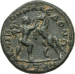 Alexander the Great standing, right, wearing chlamys, placing bridle on Bucephalus, rearing