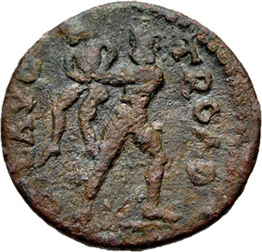 Heracles nude standing, right, head left, wrestling against the giant Antaeus and lifting him off the ground