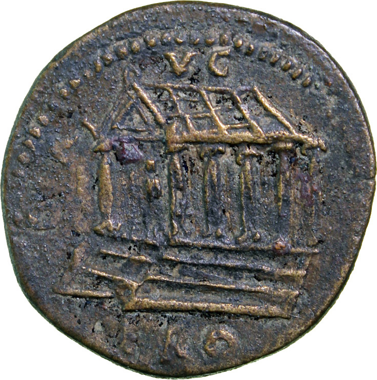 temple with two columns in perspective, left, within which Apollo Smintheus standing, right, holding bow and patera(?)