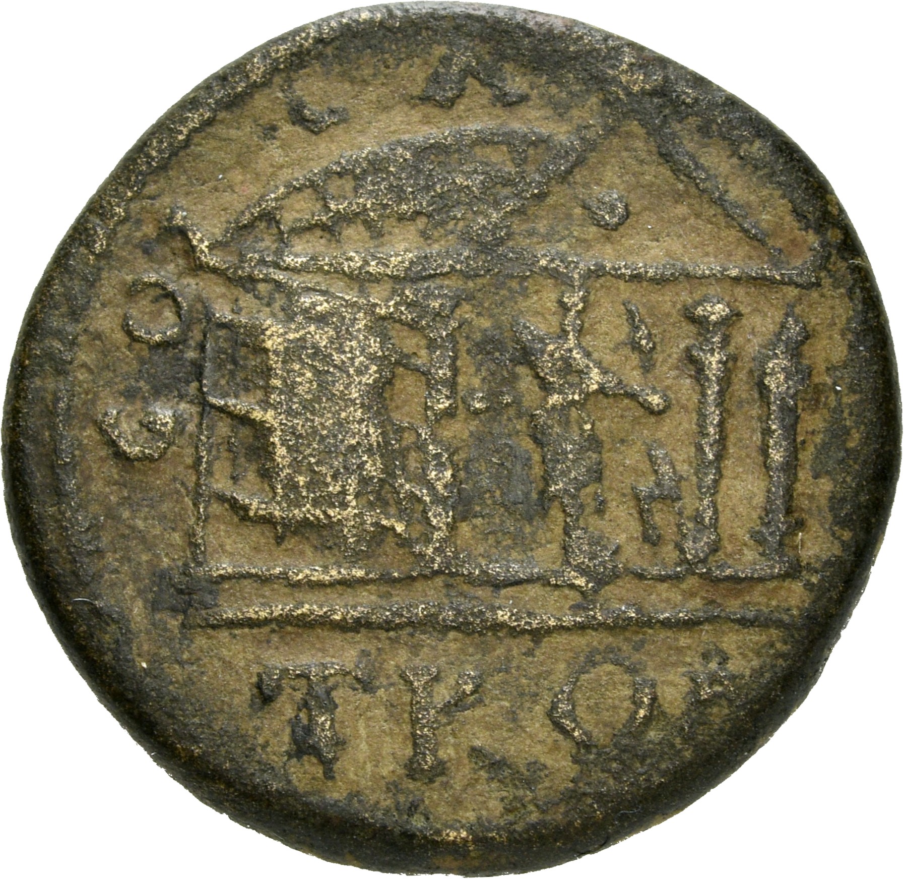 temple with three columns in perspective, right, within which Apollo Smintheus standing, right, holding bow and patera over tripod
