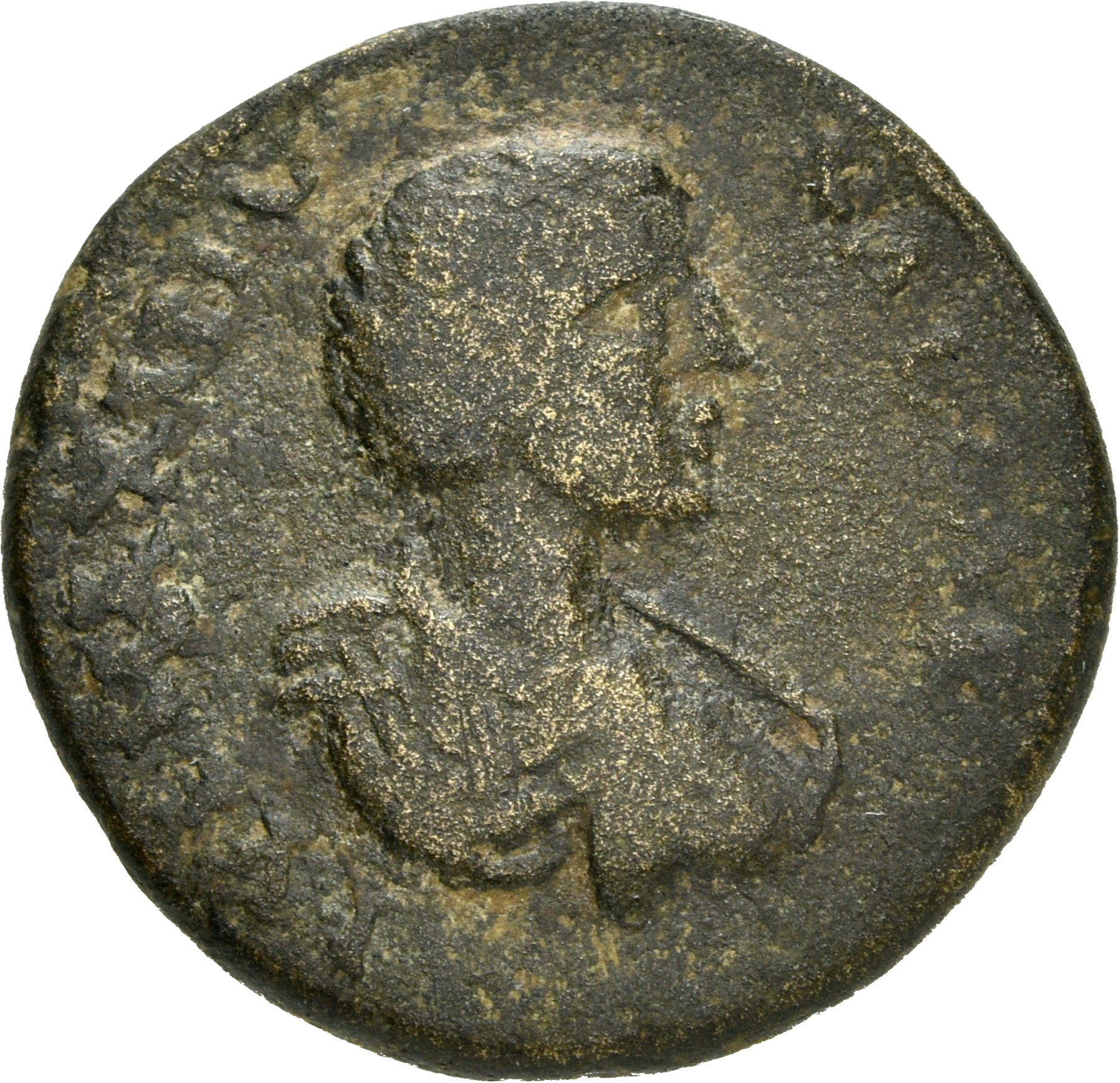 bare-headed, draped and cuirassed bust of Maximus, right, seen from rear