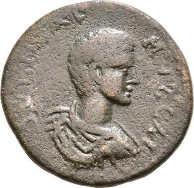 bare-headed, draped and cuirassed bust of Maximus, right, seen from rear