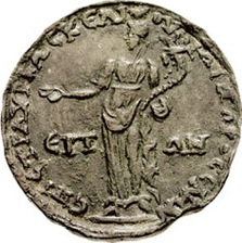 Serafini 1937, p. 427 no. 61 (not illustrated) = A. Hostein, ‘Des médaillons pour les morts. Observations sur les monnaies de la catacombe de Saint Pamphyle un siècle après leur découverte’, Journal of Archaeological Numismatics, 9, 2019 [2020], p. 241-260. It was found in the San Panfilo catacomb in Rome, used as an ornament, fixed in the mortar of a loculus. |