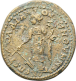 Tyche standing facing, head left, wearing kalathos, holding rudder and cornucopia |