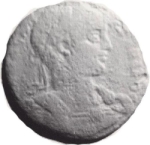 Tyche standing, left, wearing kalathos, holding rudder and cornucopia, and Poseidon standing, right, holding trident and dolphin over lighted altar |