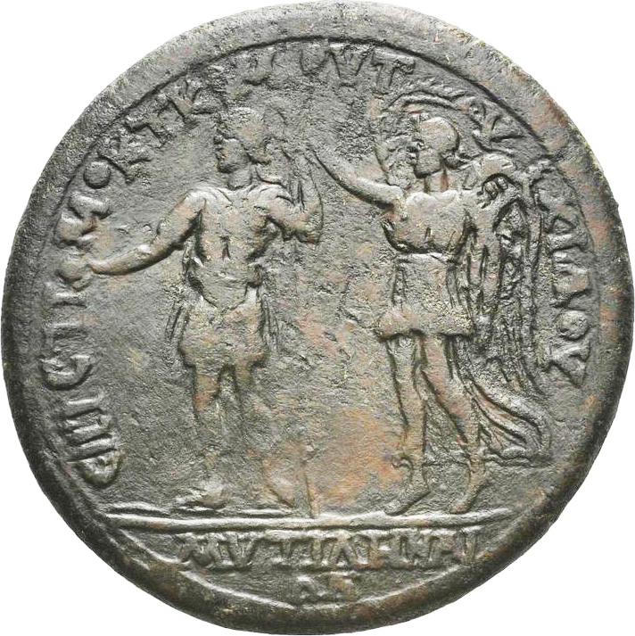 the Emperor standing in military dress, left, holding globe and resting on spear, being crowned by Nike standing, left, behind him, holding palm branch and wreath
