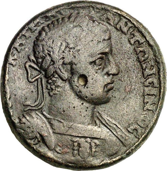 laureate bust of Elagabalus, right, wearing cuirass decorated with Gorgoneion, seen from front