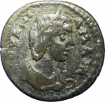 front view of temple with four columns with globe in pediment, within which Tyche standing facing, head left, wearing kalathos, holding rudder and cornucopia |